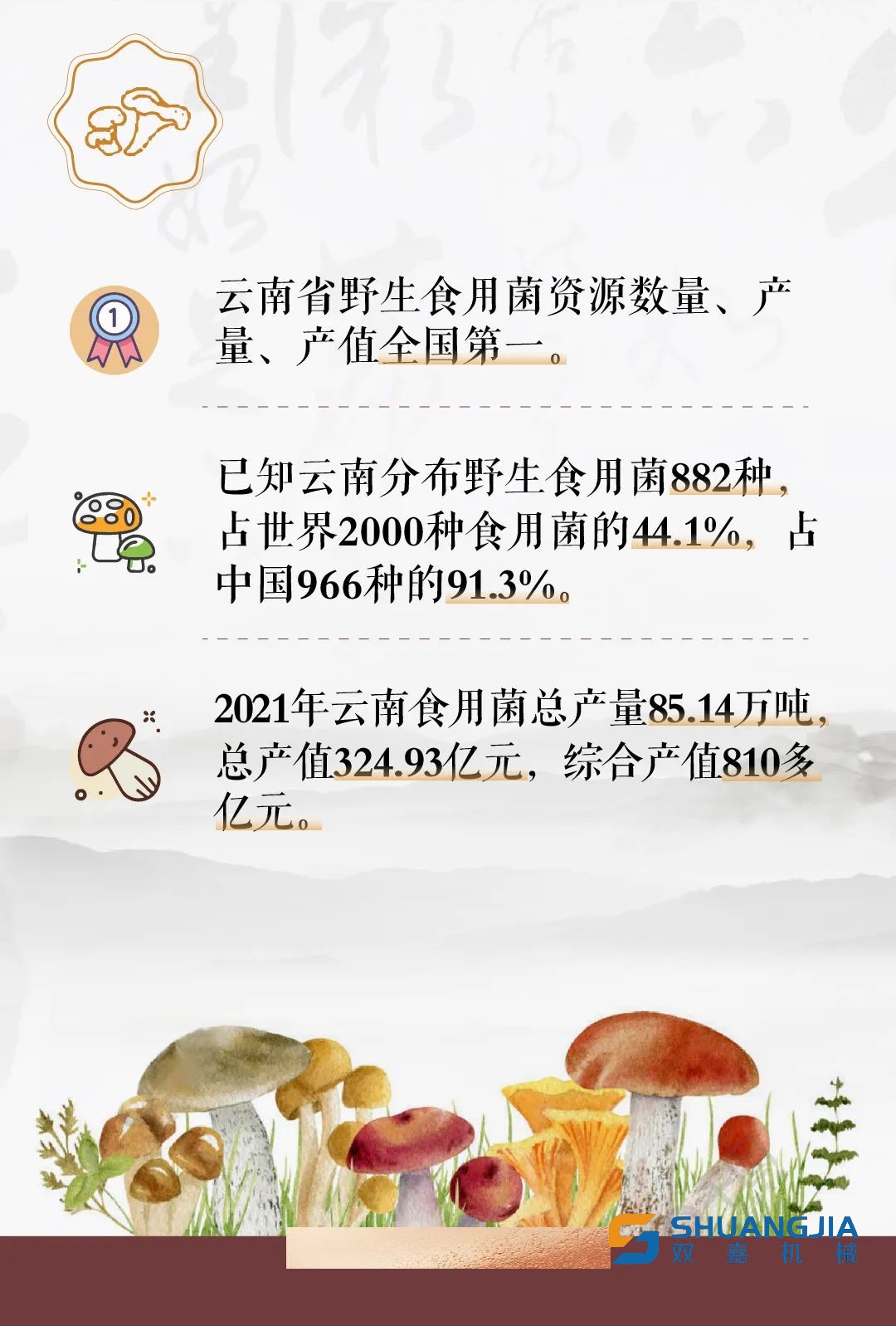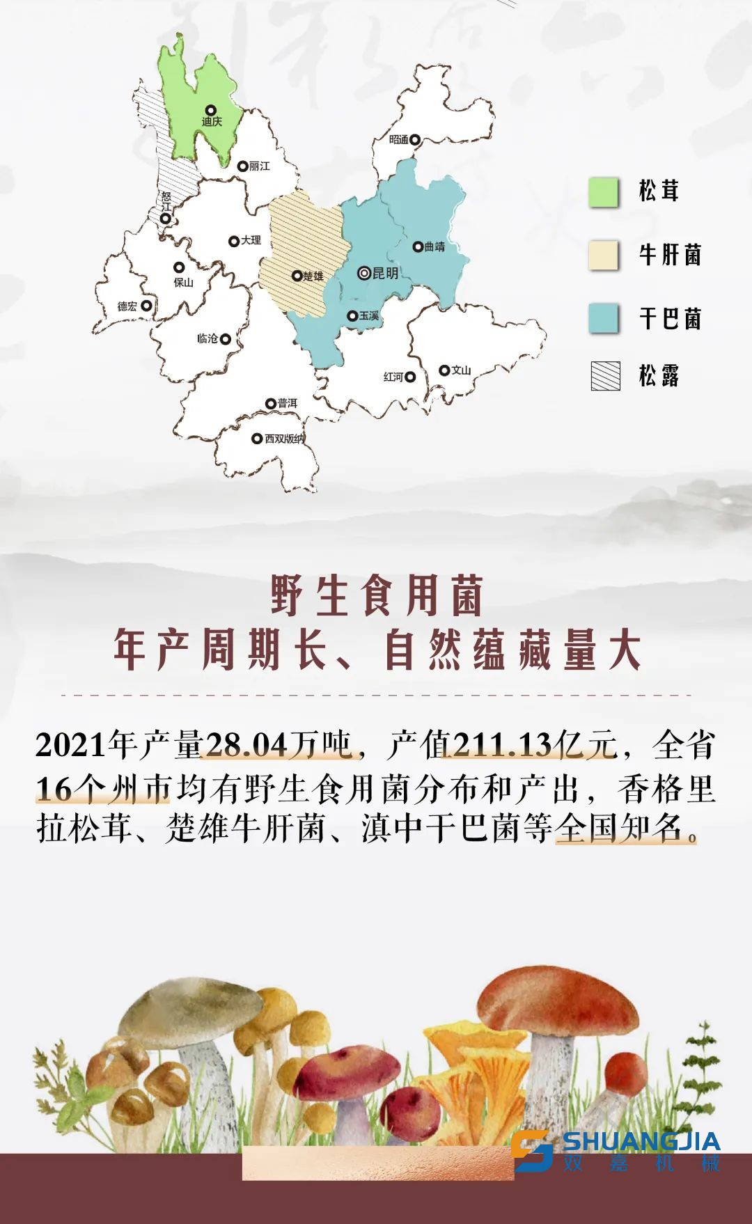 2021年,云南全省野生食用菌产量28.04万吨,产值211.13亿元;栽培食用菌规模逐步发展,年产量57.1万吨,农业产值113.8亿元;云南食用菌总产值全国排名第二位,出口创汇连续20多年超过1亿美元。
