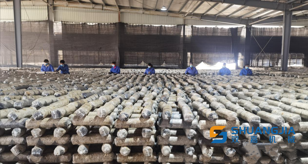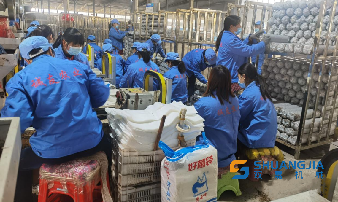 伴随着机器的轰鸣声,工人们正在装袋、转运、灭菌、上架,整个车间一派繁忙景象。大棚内,成千上万的菌棒犹如“甲士”一般整齐排列,场面壮观,“跃跃欲试”的小香菇正在“探头张望”。