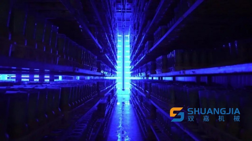 菌丝经过27天左右的生长后就可以进入釆收环节,这27天就在生育室(菇房)里成长。蓝光波段一方面可以促进金针菇生长,另外一方面还有消菌杀毒效果。