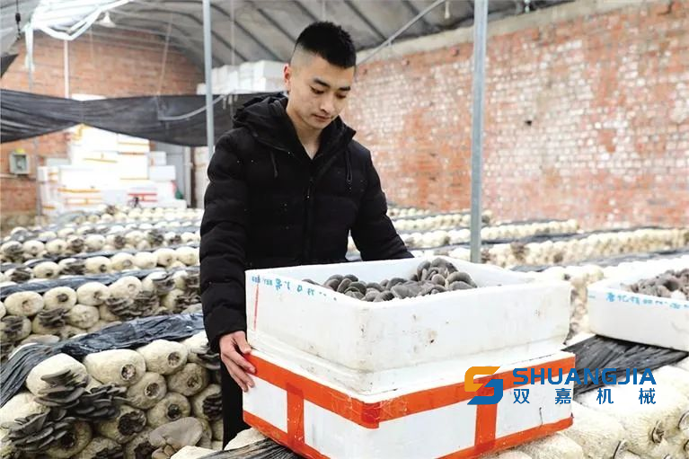 合作社负责人王金山介绍,种植基地每亩产量20吨左右,一年可产两到三茬成品蘑菇,效益十分可观。“我们将玉米棒粉碎,掺入麸皮、白灰,发酵后装入塑料袋,经过高温消毒后进行接种就可以形成菌棒。”王金山说,“等菌棒约生长一个半月后完全变成白色就能长出蘑菇,可连续生产5至6个月,直至养分耗尽,每亩可放置菌棒约两万个。菌棒是蘑菇生长的培养基,能为蘑菇提供充足的营养。”